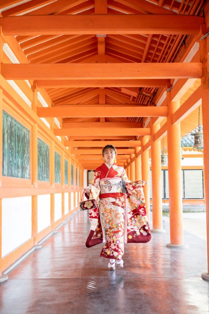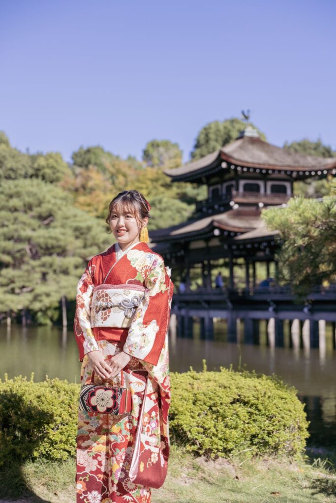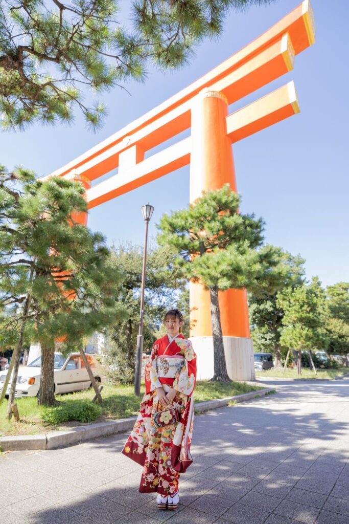 朱色の大鳥居と広々とした境内、そして秋の光に包まれる白砂が、赤の振袖をいっそう華やかに引き立てていました。