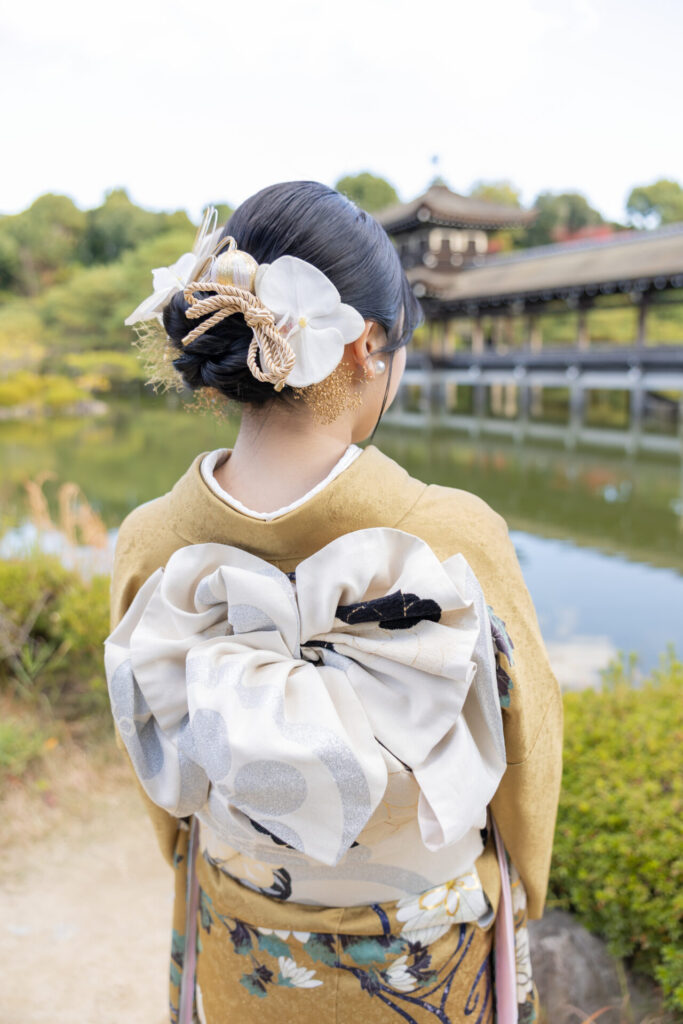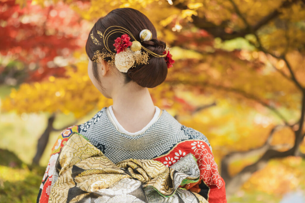 そして和のイメージにかかせない、水引で、和髪の印象になるコーディネート。