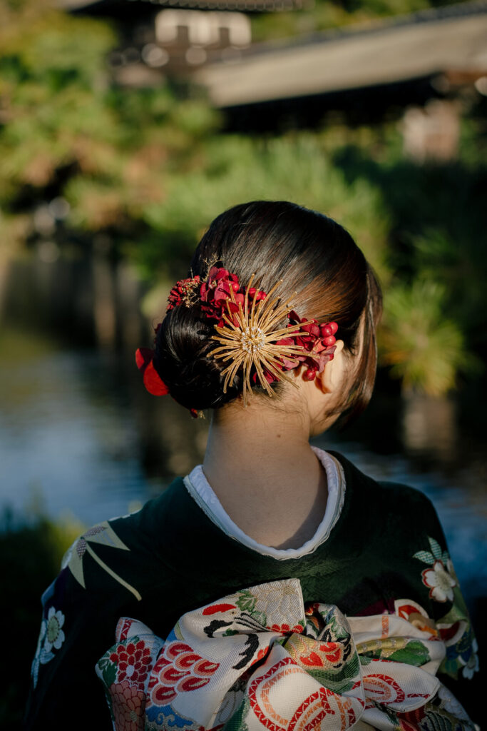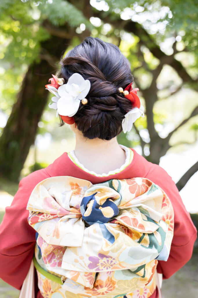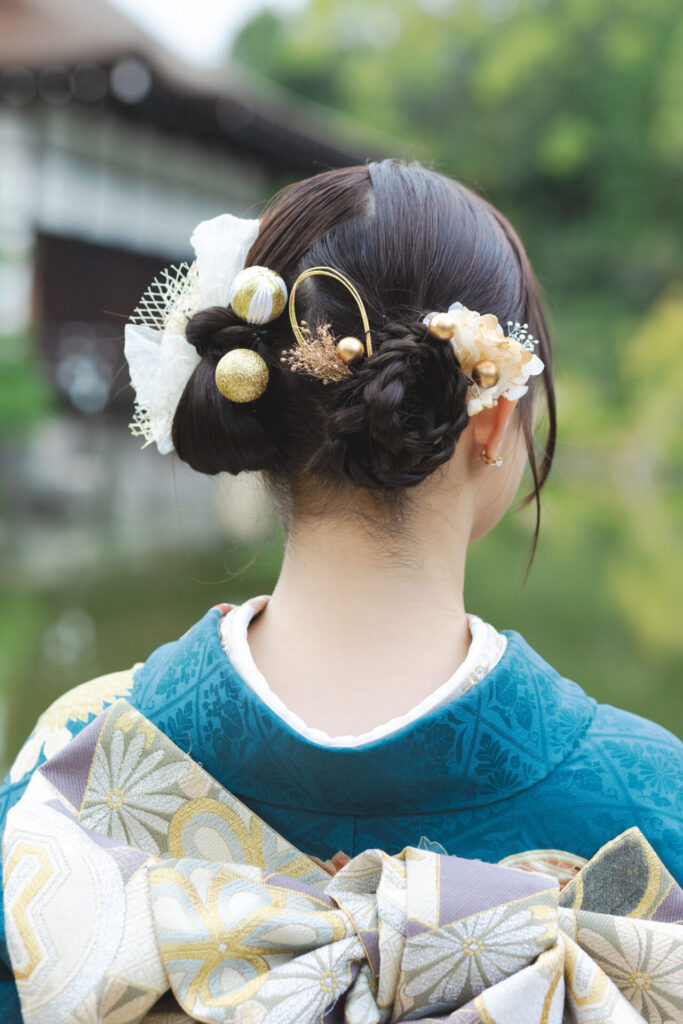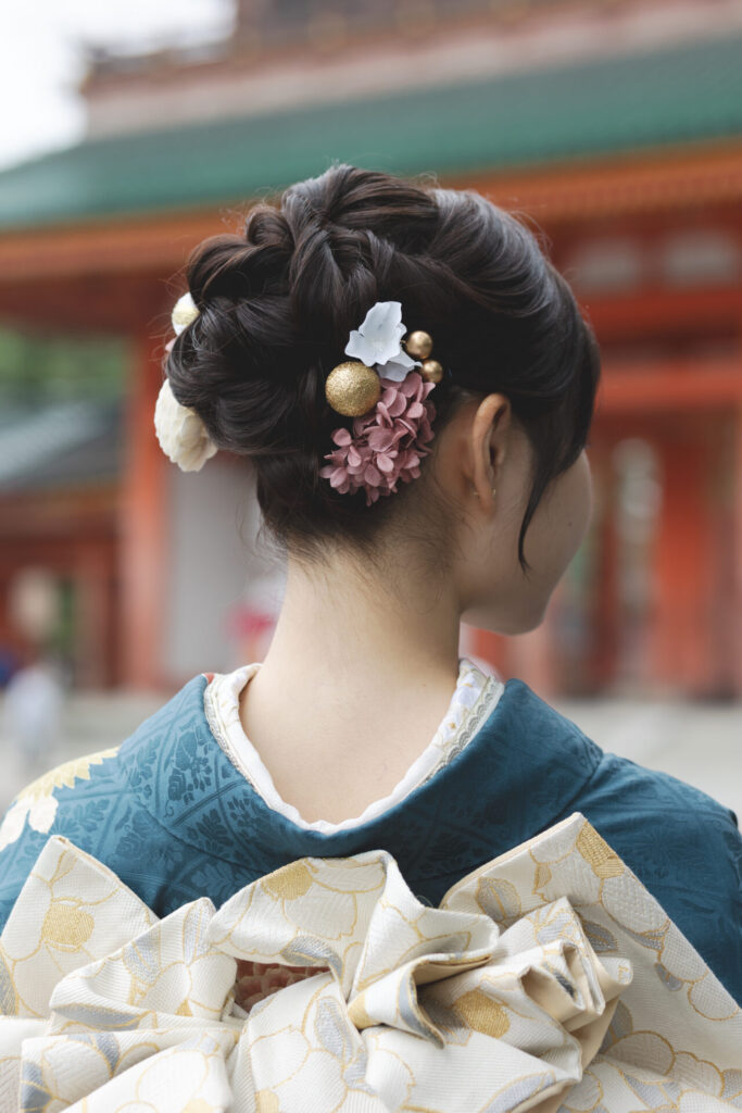 ご自分のお着物とコーディネートされた、つまみ細工とお花の飾り。