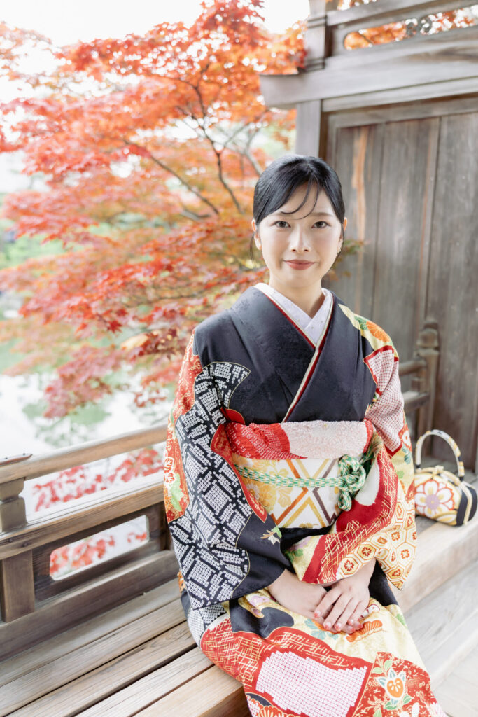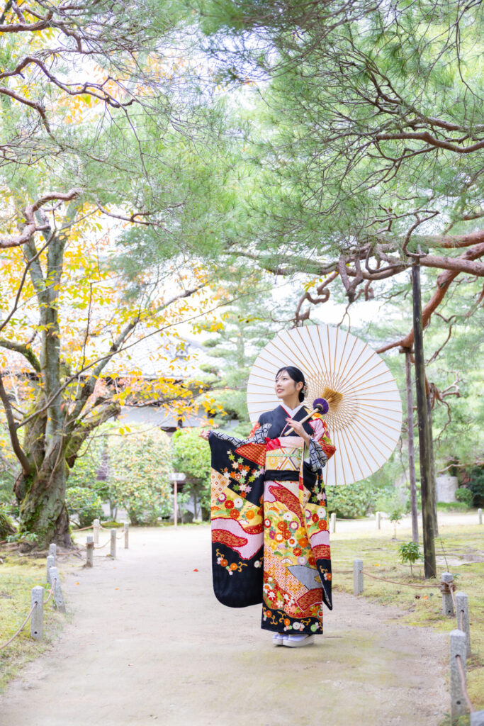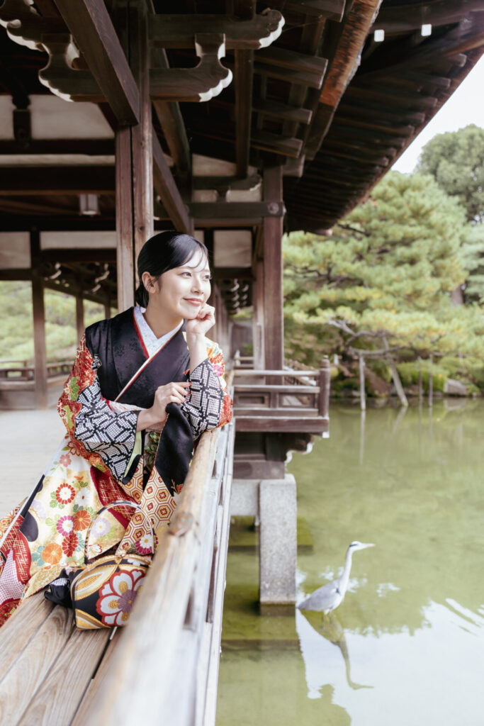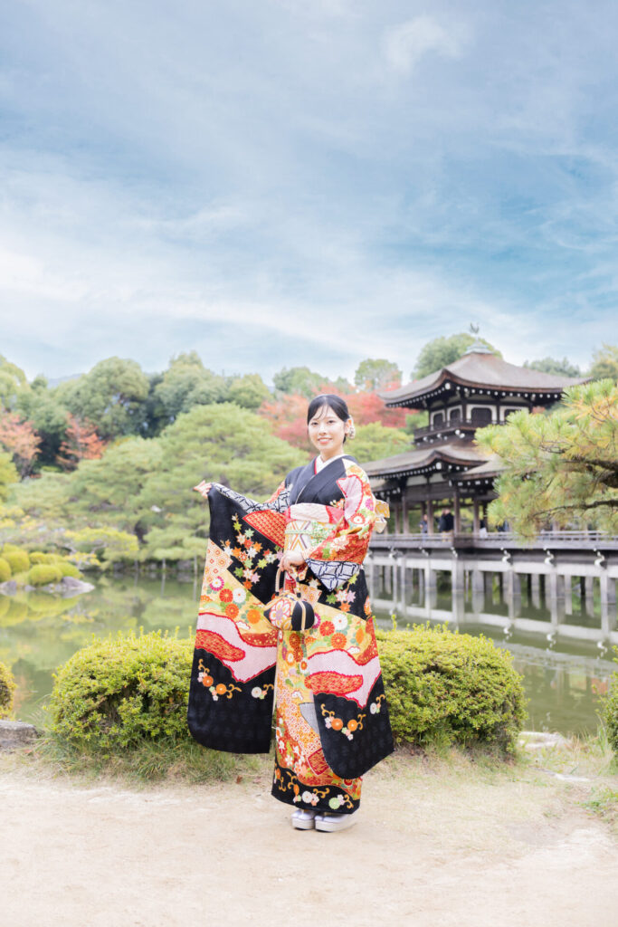 ご自前の黒地の豪華な振袖は、平安神宮の神苑や回廊にもとてもマッチ。