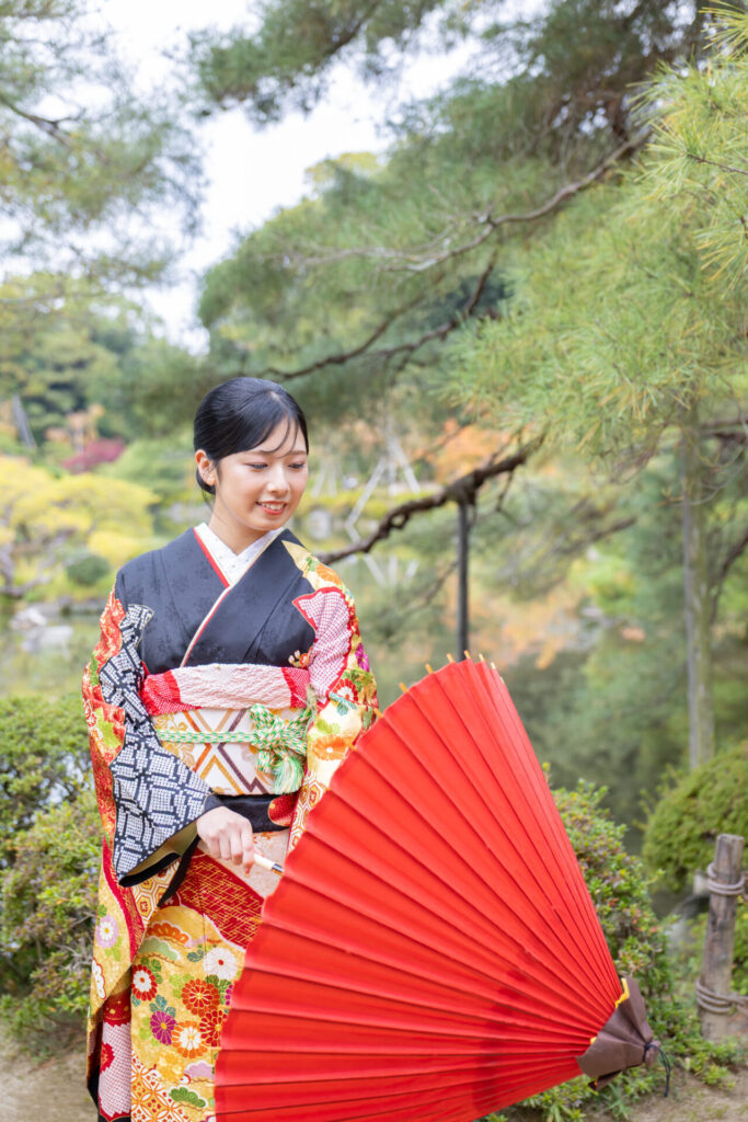 赤の番傘は、振袖を引き立ててくれます。