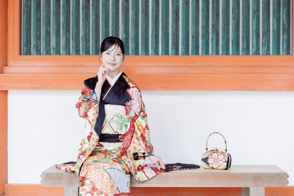 厳かな雰囲気の中で、振袖の美しさが際立つ伝統的なショット。